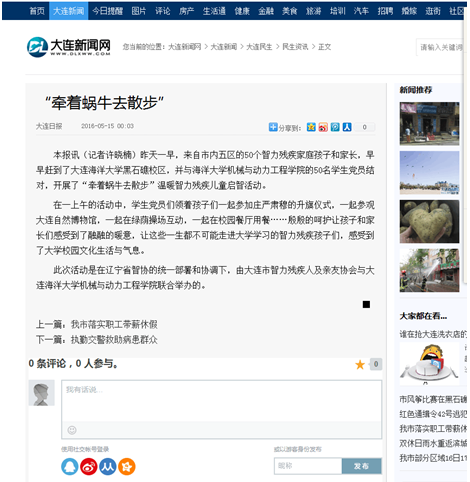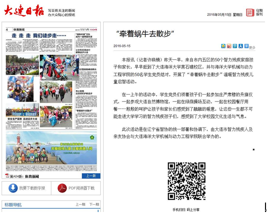 近日,大连日报、大连广播电台新闻广播FM103.3、搜狐网、大连新闻网、等多家媒体分别报道了由大连市智力残疾人及亲友协会与我校联合举办的“牵着蜗牛去散步”温暖智力残疾儿童的启智公益活动。此次活动由蜜桃堂 全体党员、学生干部志愿者与50组智力残疾儿童家庭结对,带领家庭共同对加了升旗仪式、文艺汇演、参观大连自然博物馆等一系列公益活动。