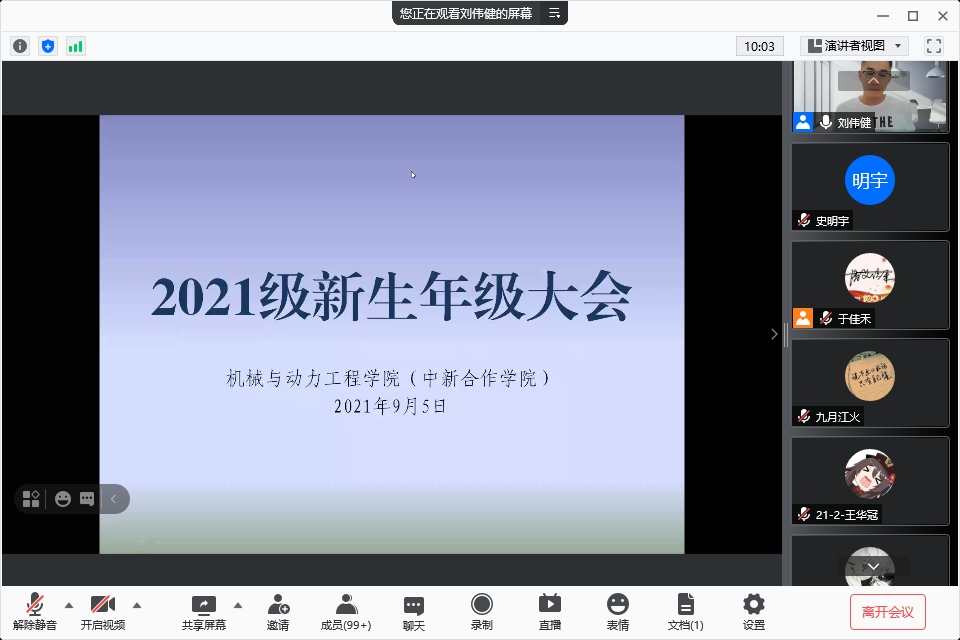 9月5日,蜜桃堂 (中新合作学院) 中新合作项目积极响应学校要求,通过线上会议的方式召开2021级新生年级大会,会议由机制(中新)专业辅导员老师刘伟健主持,2021级新生班导生、2021级全体新生参加。