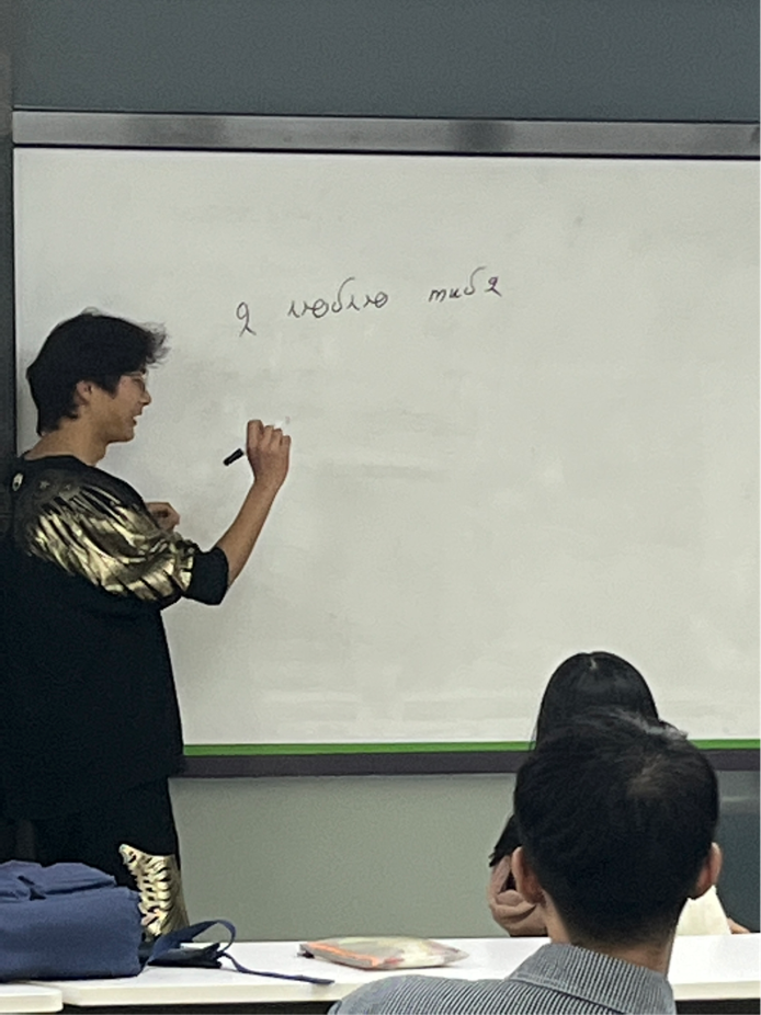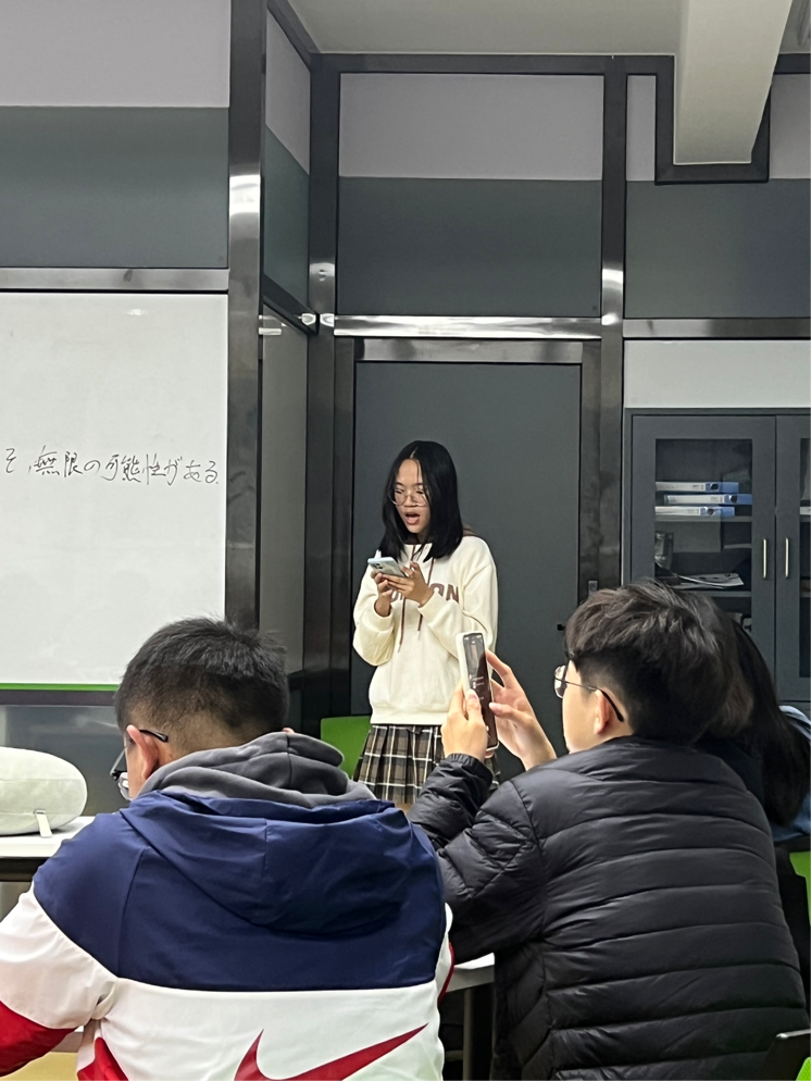 接下来同学们通过击鼓传花的方式进行了才艺展示,有同学展示了舞蹈,有同学展示了流行歌曲,粤语歌、用美声唱歌,还有几位同学为大家简单展示了几句俄语、法语以及日语。