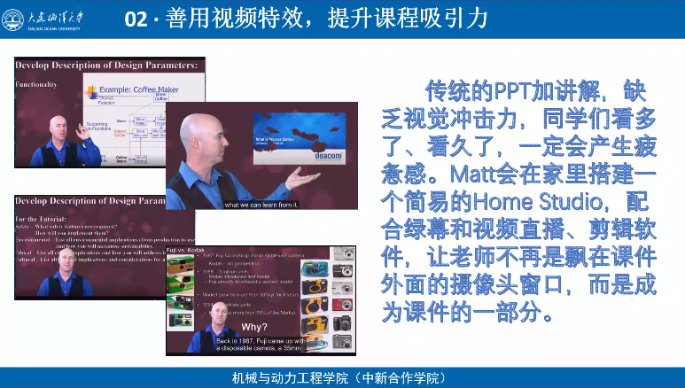 于赢水老师是中新合作办学项目引进外方课程《产品设计工程》的助课教师,他的分享主要围绕“控制课堂教学容量、善用视频特效、善用摄像头按钮和充分发挥学习小组作用”这四个方面展开,将外方课程设计理念和本土学生特点相结合、理论性和操作性相结合,图文声像并茂,给予了我校教师一些有益的启发。