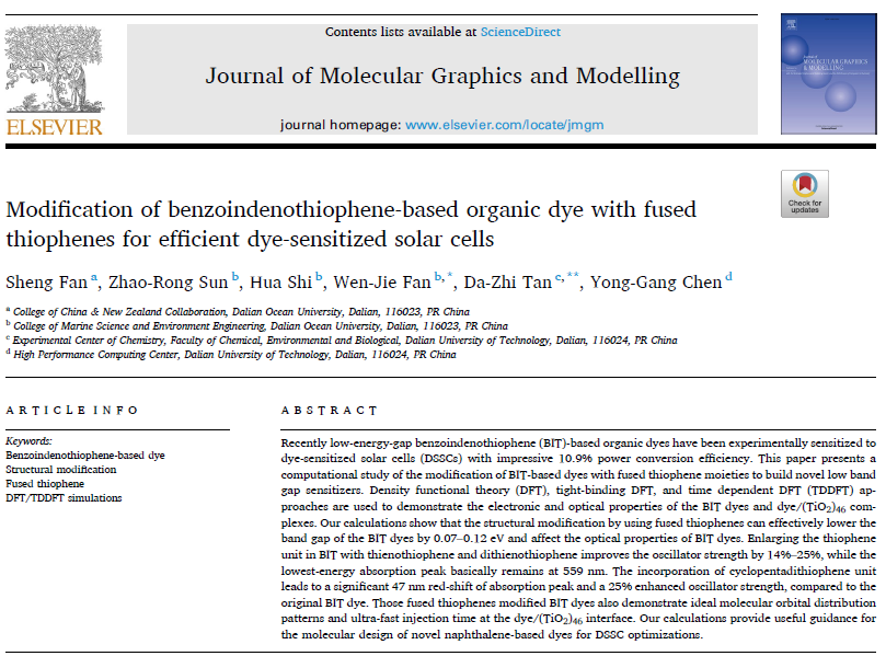 近日,蜜桃堂 2019级中新合作办学项目学生樊晟作为第一作者的研究论文Modification of benzoindenothiophene-based organic dye with fused thiophenes for efficient dye-sensitized solar cells在线发表于期刊Journal of Molecular Graphics and Modelling。本论文研究了噻吩衍生物修饰benzoindenothiophene染料的光电性质及其在染料敏化太阳能电池领域的应用,研究成果为新型窄带隙全有机染料分子的设计和优化提供了参考信息。