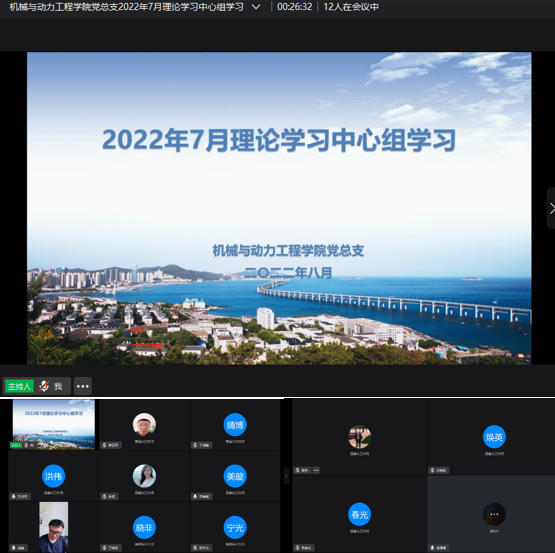 党总支在钉钉线上平台召开2022年7月理论学习中心组学习会议。学院党总支理论学习中心组成员、各党支部书记参加会议,本次学习由党总支副书记刘洪伟同志领学。