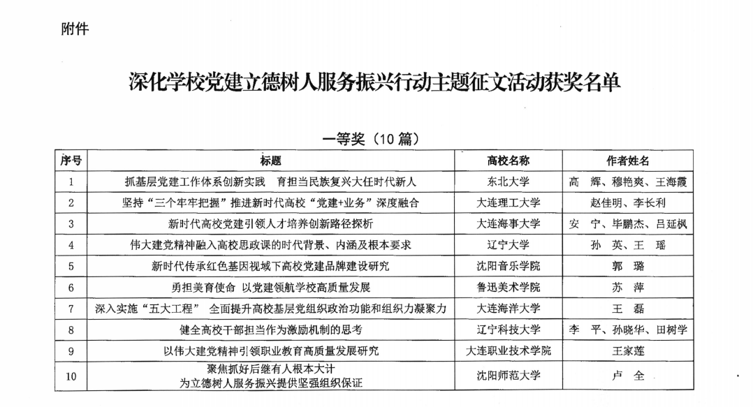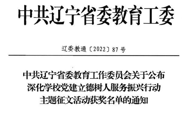 近日,省委教育工委下发《关于公布深化学校党建立德树人服务振兴行动主题征文活动获奖名单的通知》(辽委教通[2022]87号),经专家评审,会议研究,确定一等奖征文10篇,二等奖征文20篇,三等奖征文32篇,优秀奖征文25篇。我校蜜桃堂 党总支副书记王磊荣获一等奖。