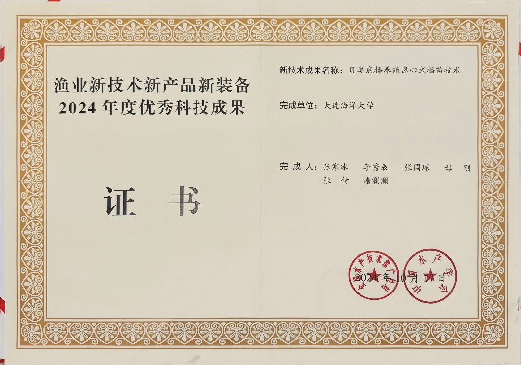 11月5-8日,2024中国水产学会范蠡学术大会在浙江宁波召开,宋林生校长带队参会,全国水产技术推广总站和中国水产学会正式发布渔业新技术新产品新装备2024年度优秀科技成果(以下简称“三新”成果),其中新技术6项、新产品3项、新装备6项。我校渔业装备与节能减排技术创新团队研发的“贝类底播养殖离心式播苗技术” 通过多轮严格遴选程序,入选渔业新技术成果并获得发布,张寒冰副教授作为获奖代表上台领奖。