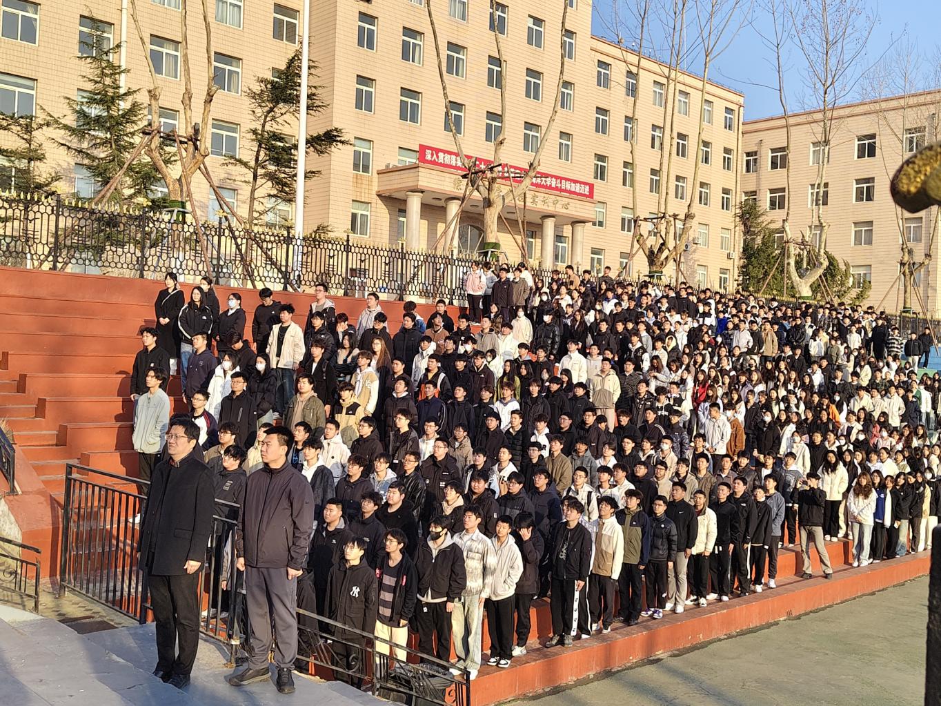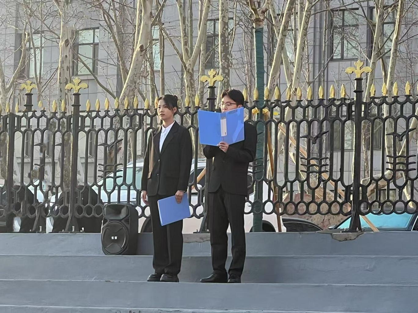 农业智能装备工程2024-2班彭紫豪主持,能源与动力工程2024-1班团支部书记谷昱莹在国旗下讲话,学院党总支副书记王磊,团委书记贺宝华及黑石礁校区全体2024级学生参加。