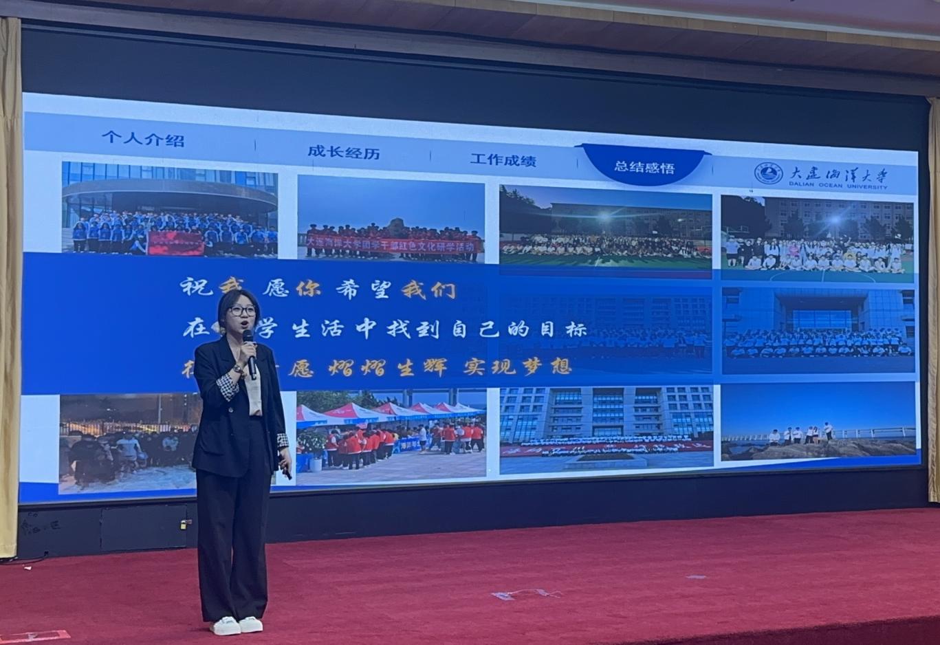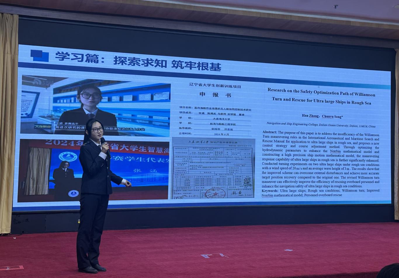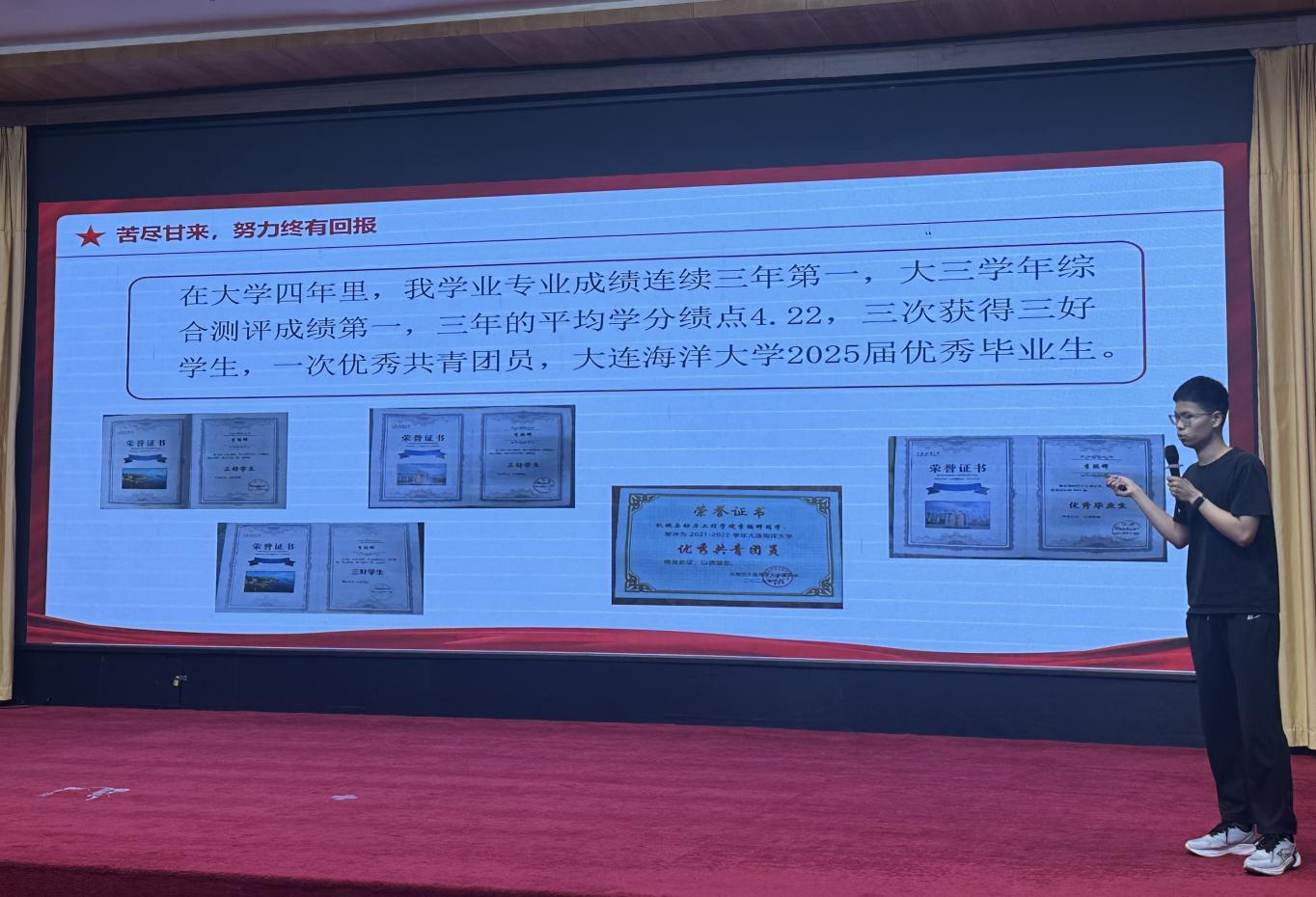 学院邀请学校学风建设宣讲团成员航海与船舶工程学院航海技术20221班张涵、荣获创新创业类省奖并保送至长安大学的能源与动力工程20212班李腾辉,辽宁省第二届大学生职业规划大赛决赛中铜奖获得者农业智能装备工程20222班张海光和海洋骄子宣讲团的农业智能装备工程20222班史效齐。他们结合自身在大学校园的学习成长经历与感悟,分享了在专业学习、科创竞赛、学生工作、社会实践和志愿服务等方面的奋斗故事。他们用扎实的专业基础、创新的实践精神和奉献的青春担当,生动诠释了优良学风的深刻内涵,现场气氛热烈,不时响起热烈掌声。