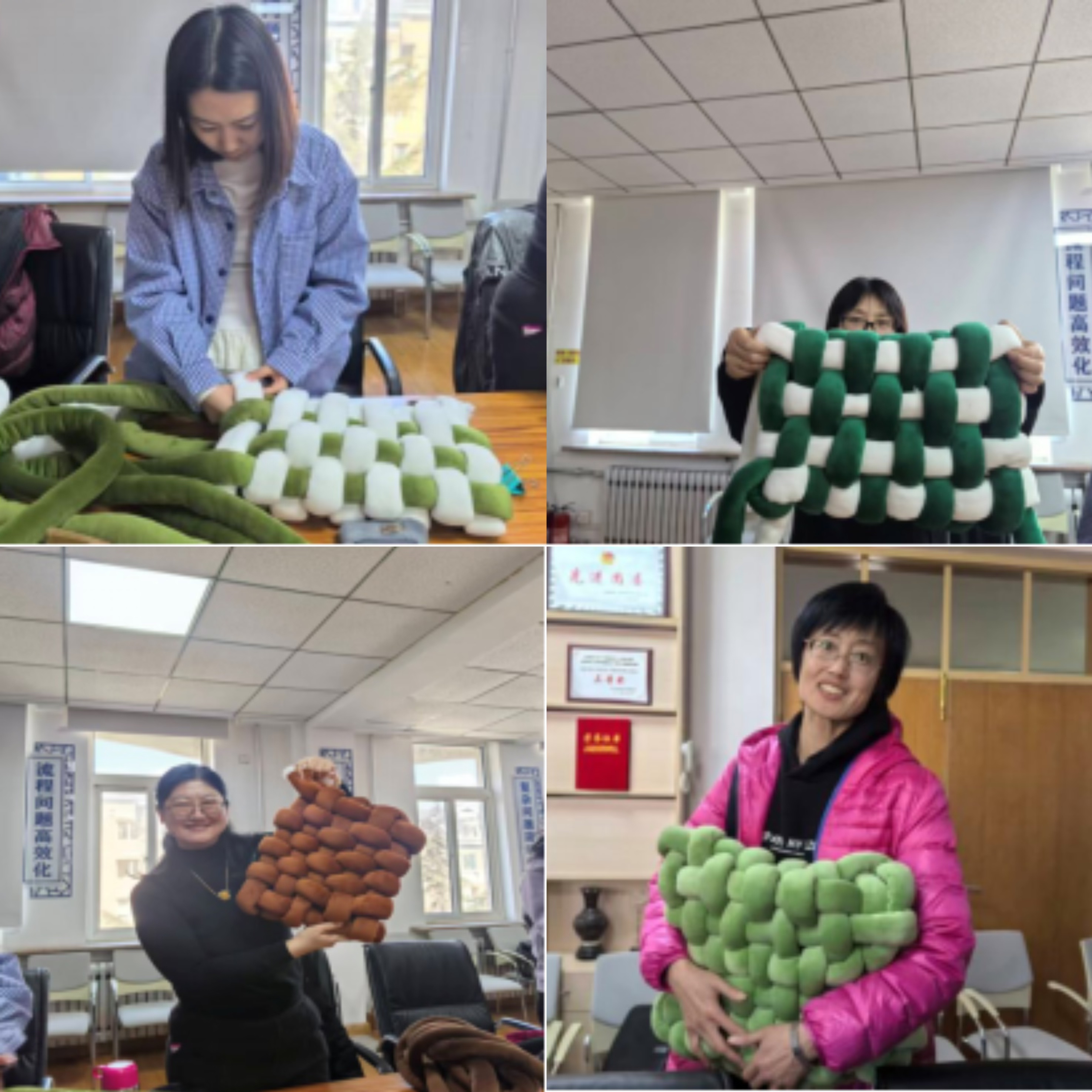 活动现场老师们围坐在一起,暂时放下繁忙的工作,卸下疲惫,在轻松舒缓的氛围中,化身心灵手巧的“手工达人”,用“胖乎乎”的冰岛毛线编成暖心坐垫、可爱抱枕。大家一边动手制作,一边轻松交流,欢声笑语不断。平日里在讲台上传道授业、严谨认真的老师们,此刻尽情享受手工创作带来的乐趣,在编织中舒缓压力、放松心情,感受慢时光的治愈与美好。
